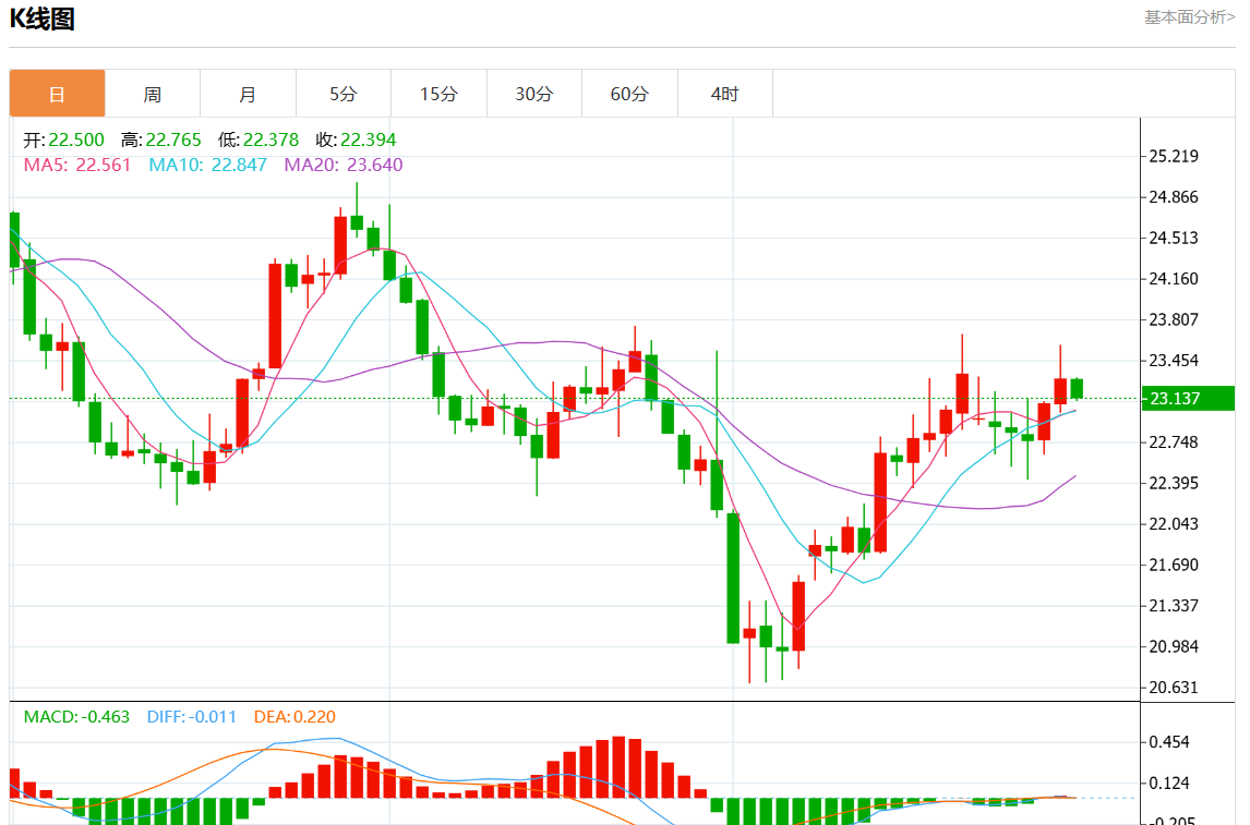 周二欧市盘中,现货白银报23.200,跌幅0.43%。