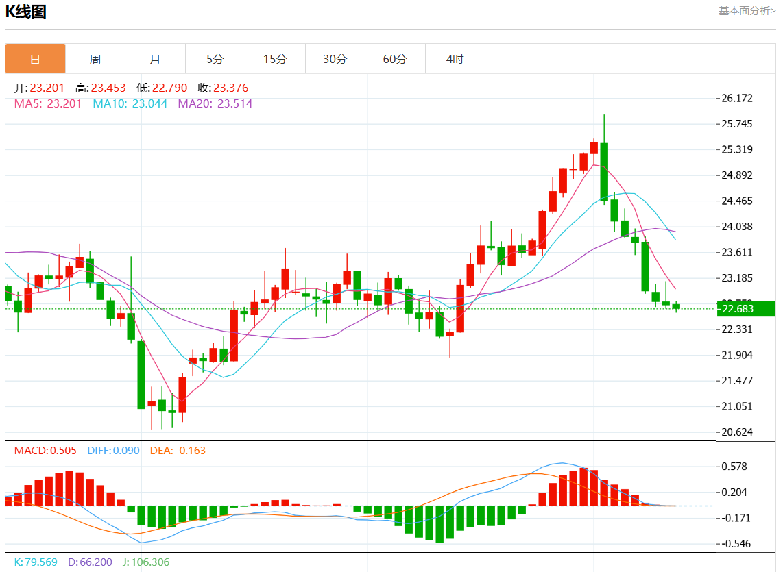 周三欧市盘中,现货白银报22.676,跌幅0.29%。