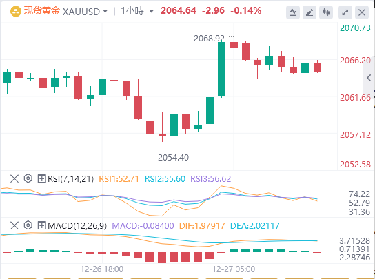 上周五公布的PCE通胀数据弱于预期,交易员加大了对央行最早将于2024年3月开始降息的押注。数据显示市场预计2024年3月降息25个基点的可能性超过70%。且高盛表示,美联储将在2024年3月份降息之后,在2024年上半年再降息两次。核心通胀放缓和对经济衰退的担忧加剧,导致美联储官员的言辞从以长期较高利率对抗通胀的承诺转向向市场保证他们不会‘坚持’较高利率太久。这对黄金来说是个好消息,并且在2024年的大部分时间里都应该继续是好消息。今日日内市场将迎来美国12月里奇蒙德联储制造业指数,预计该数据能对黄金带来较大的市场波动,因此建议投资者密切关注。