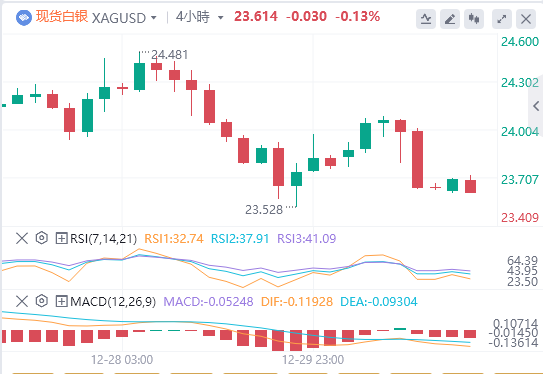 从白银4小时周期图看,白银自前期低点22.49附近起涨以来,上穿双均线MA20和MA60后,一路受MA20和MA60支撑,最高至24.59附近,后向下回落,最低至23.52附近。图中可见由低点22.49至高点24.59做黄金分割线,价格回落已至50%的关键支撑位,当前价格在24.21至23.52区间做震荡整理,日内若有回落当逢低做多为主。下方支撑关注23.52、23.13附近,上方压力关注24.08、24.21附近。