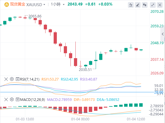 昨夜公布的美国12月ISM制造业PMI升至47.4,高于预期的47.1和前值46.7,此前已经连续两个月保持在46.7不变。12月高于前两个月,说明美国经济有所改善,并没有市场预料的那么差,也进一步印证了美国经济软着陆的可能性正在增大。经济数据的改善,叠加会议纪要和官员们的讲话打压了美联储将在2024年降息三次的预期,这些数据和讲话料将对短期美元指数形成支撑作用,对于金价形成压制作用。