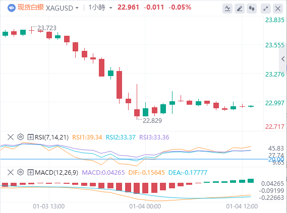 从白银1小时周期图看,银价自高点24.59附近下跌以来,下穿均线系统MA20和MA60,最低至23.94附近,随后又反弹至24.49附近开启第二波跌势,此后行情一路下跌,高低点同步下移,并受均线系统压制后加速下跌,最低跌至22.82附近,图中可见价格当前仍受均线MA20压制,CCI顺势指标在0轴之下减缓上行动能,并拐头向下,日内如有反弹至23.09附近压力位可尝试布局空单。下方支撑关注22.82、22.49附近,上方压力关注23.09、23.33附近。