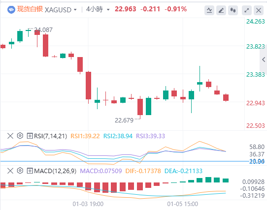 从白银4小时图来看,银价自前期高点24.59附近下跌以来,相继下破两条均线MA20和MA60,最低跌至22.67附近,后在22.67-23.18附近区间震荡。非农数据公布后,价格跌至22.76附近,随后反弹,最高上行至23.50附近遇阻回落,周五报收23.09附近。连接前期高点24.47附近和24.08附近,作一条下行趋势线,可见趋势线与前高23.50附近对价格具有共同压制作用。下方顺势指标CCI处于超买区间,并拐头向下,显示价格反弹力度减弱,随时可能继续下跌。故日内如有反弹,当以逢高布局空单为主。