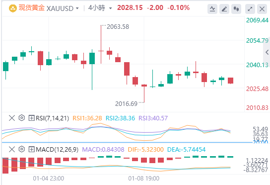 从图中黄金4小时周期图来看,从波浪角度来看,黄金从上方2088一线附近开启新的五浪下行走势,并突破左方关键支撑平台,形成下跌推动,当前处于ABC调整浪当中的B转C阶段,可借助技术性ABC调整后继续顺势布局空单。从下方MACD指标来看,量能进行了空头放量后,开始修复。所以,操作上建议逢高尝试做空思路为主。