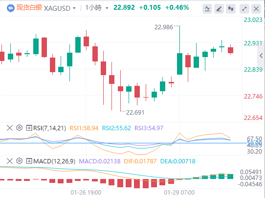 白银1小时周期来看,行情前期走了一波多头走势结构,随着行情不断上行,MACD多头动能同步放缓,预示多头上行动能已逐步衰竭。同时,行情已下破上行趋势线,并在反弹回测趋势线时得到压制,23.00附近亦形成水平压力。当前MACD出现尝试下穿零轴信号,行情有短线转空迹象。策略上建议尝试逢高布局空单为主。