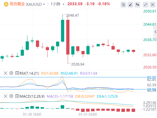 据CME美联储观察显示,美联储2月维持利率在5.25%-5.50%区间不变的概率为97.9%,降息25个基点的概率为2.1%。到3月维持利率不变的概率为58.3%,累计降息25个基点的概率为40.9%,累计降息50个基点的概率为0.8%。今晚凌晨将迎来美联储今年首次议息会议,市场预计在本次会议上,美联储维持利率不变,市场聚焦于晚些时候美联储鲍威尔在新闻发布会上的讲话,交易者期待从鲍威尔讲话中寻找关于降息的更多线索。