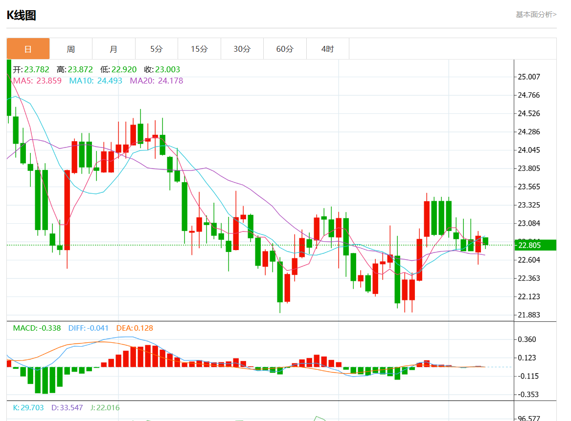 周一欧市盘中,现货白银报22.780,跌幅0.61%。