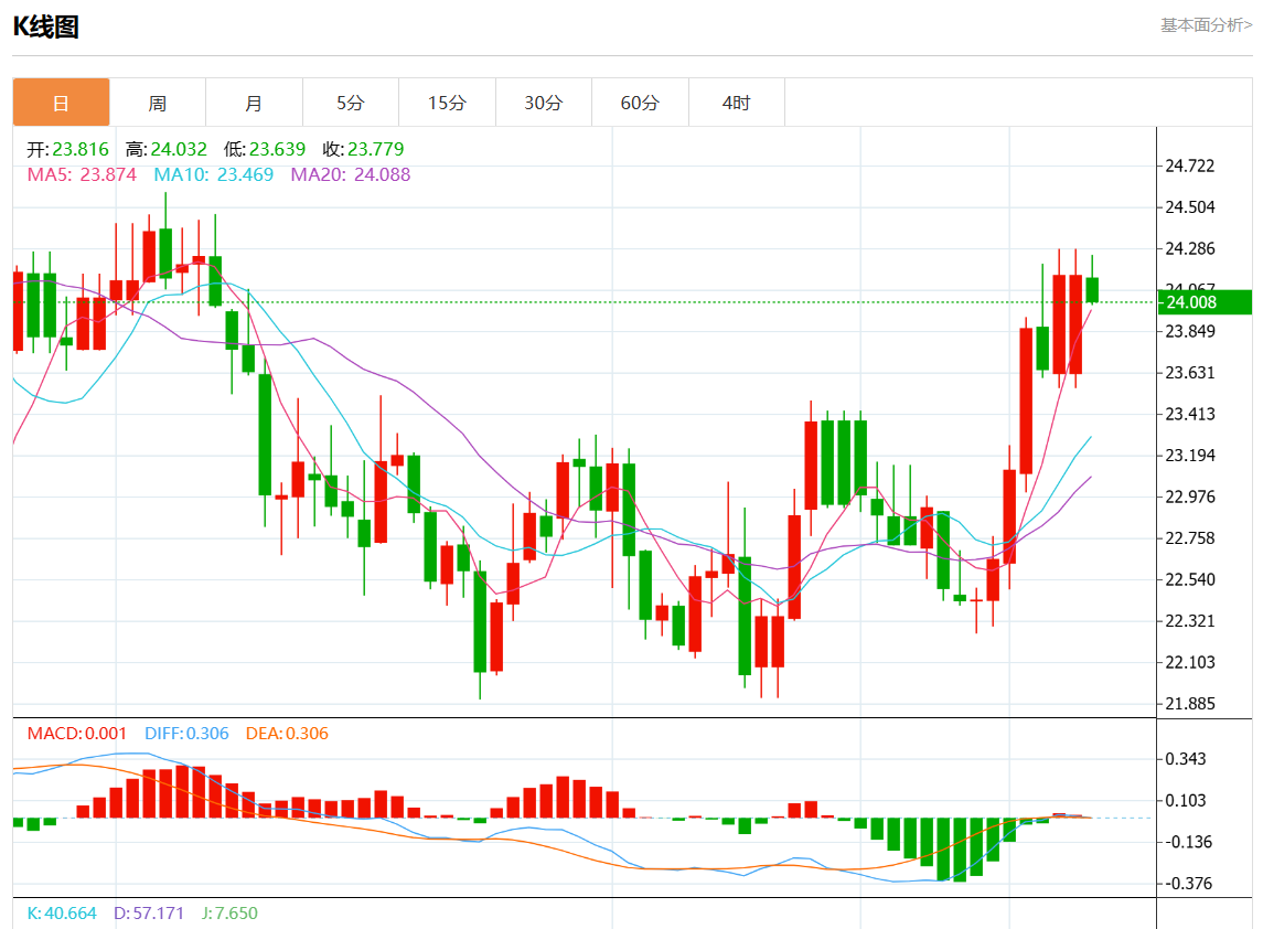 周四欧市盘中,现货白银报24.192,涨幅0.20%。