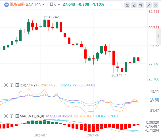 从白银4H周期图来看,价格经过前期大幅下跌行情,空头下跌幅度和力度都已经有所减缓,价格在26.44附近受到月线级别支撑影响后,逐步上行,并逐步在4小时级别逐步上破双均线系统,显示行情当前多头强势,短期回落后继续上行概率较大。下方CCI指标从超买区间拐头向下,预示行情可能有所回落,日内可以等待银价回落至27.20支撑位附近,尝试布局多单。