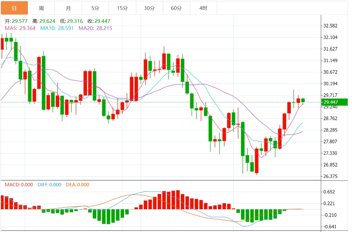 今日银价交投将位于支撑位28.70美元/盎司以及阻力位29.55美元/盎司之间。