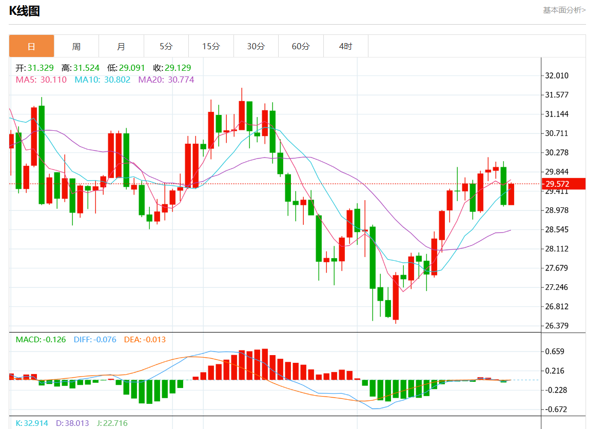 周四欧市盘中,现货白银报29.274,涨幅1.24%。