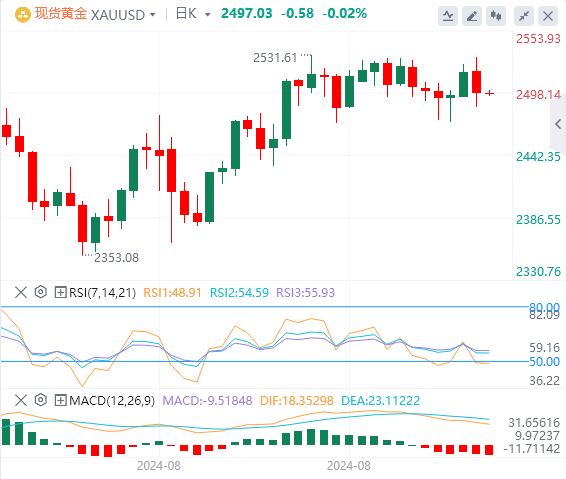 金价下跌,从盘中稍早触及的接近纪录高位的水平回落,此前公布的美国就业报告喜忧参半,令市场对美联储本月晚些时候降息的幅度产生怀疑。现货金下跌0.8%,至每盎司2497美元附近。