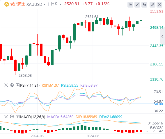 黄金价格目前维持高位震荡,保持突破后的强势,已经持续了近3周。价格自低点上行至高点2531附近后,有所回落,随后进入震荡整理阶段,多次冲高不破,表明多头动能有所减弱,但目前已经完成回踩,回踩前期的突破压力位,表明压力变支撑,调整可能到位,后期继续上行是大概率。同时均线系统从此前的多头排列逐步转向为走平,显示当前行情在高位整理,日内可回落至2505附近,尝试布局多单。