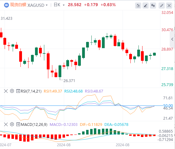 白银价格上破前期下行趋势线,形成底部反转后,形成了一波上行趋势,按通道进行波动,目前处于通道的下轨附近。均线上来看,白银目前围绕短期均线波动,并未方向。下方的MACD指标形成背离,表明价格下跌暂缓,遇到支撑。日内保持低多的思路,回落28附近接多,注意控制风险。