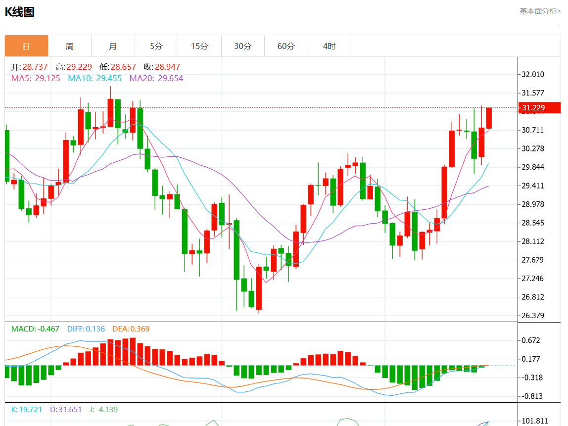周五欧市盘中,现货白银报31.280,涨幅1.66%。