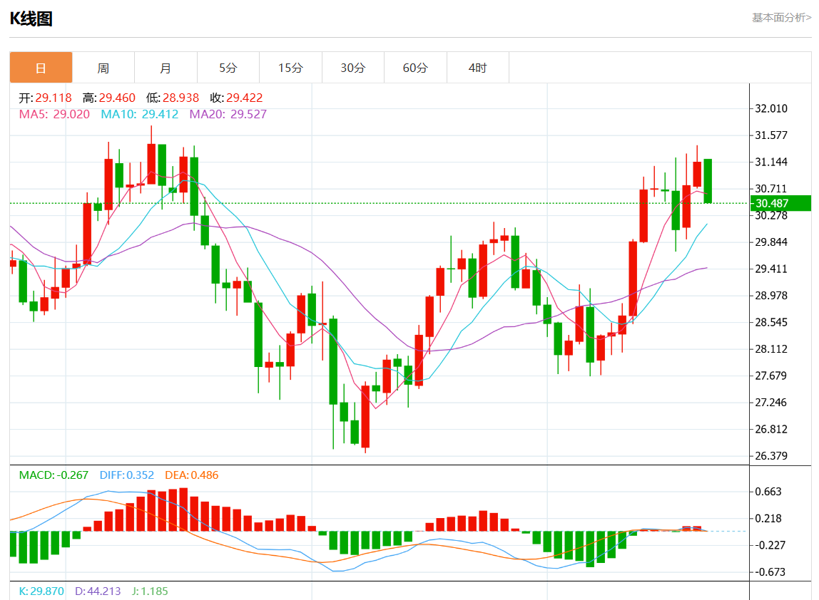 周一欧市盘中,现货白银报30.250,跌幅2.22%。