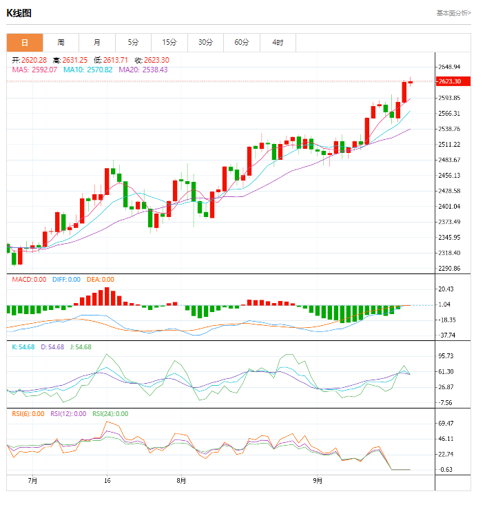 周一(9月23日)本交易日现货黄金日内维持震荡走势,今日开盘报2621.36美元/盎司,最高触及2631.31美元/盎司,最低触及2613.40美元/盎司,截止发稿金价报2616.39美元/盎司,跌幅0.21%。
