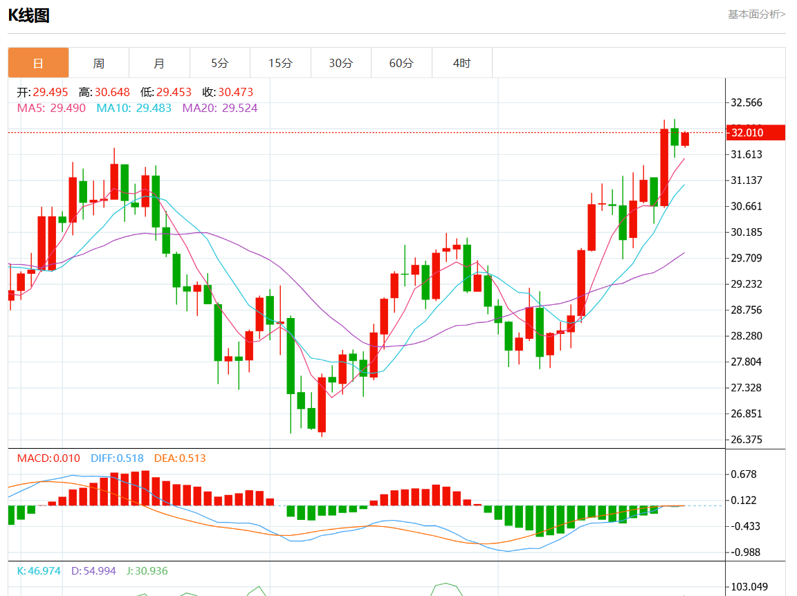 周四欧市盘中,现货白银报32.120,涨幅1.13%。