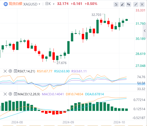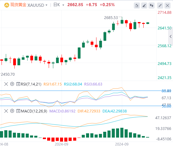 近期金价自2500.0附近受到买盘支撑,多头不断创出新高,最高达到2685.0附近,交易重心继续上移,表明金价处于多头趋势中。均线系统上,价格围绕均线来回穿插,表明当前行情处于高位震荡的状态。亚市早盘时段,价格位于隔夜收盘价附近震荡,短期不改当前高位震荡走势。日内操作上坚持逢低做多,关注支撑位2638.0附近,如若在此获得支撑,可考虑布局多单,上行关注压力位2673.0一线,若上破,多头将再次测试前高2685.0一线。