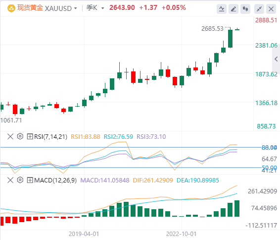 重磅消息,中国央行再次暂停购买黄金储备。10月7日,国家外汇管理局公布数据显示,9月末黄金储备报7280万盎司,与上个月持平,这已是中国央行连续第五个月暂停增持黄金。但是随着全球步入宽松周期,市场依然坚定唱好黄金。出于对经济放缓的担忧,欧央行、美联储等主要央行接连降息,包括中国宣布的一系列支持性政策,目前全球市场仍需警惕通胀风险,黄金是最佳的对冲资产。