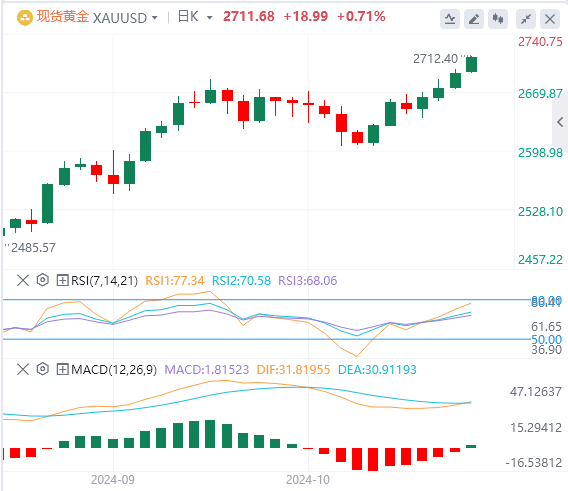 今年以来,黄金价格已经大涨逾30%,屡破新高。美联储在上个月降息50个基点后,市场普遍预期其未来可能进一步降息,加之地缘政治不确定性持续,为金价提供了有力支撑。中东局势的紧张以及美国大选的胶着状态,带来了一系列不确定性,而黄金往往是不确定时期的首选投资品种。此外,欧洲央行也在今年第三次降息,降息幅度为25个基点,将存款利率降至-0.5%。尽管这一举措帮助美元指数走高,但降息降低了持有黄金的机会成本,对金价构成支撑。欧洲央行行长拉加德表示,欧元区通胀越来越受控,而经济前景正在恶化,这促使欧洲央行从降低通胀转向保护经济增长。市场普遍预期,除非未来几周经济或通胀数据出现反转,否则欧洲央行很可能在12月进行第四次降息。未来,投资者需密切关注美国9月营建许可年化总数初值、新屋开工年化总数以及美联储官员的讲话和地缘局势相关消息,这些因素都可能对金价走势产生重要影响。