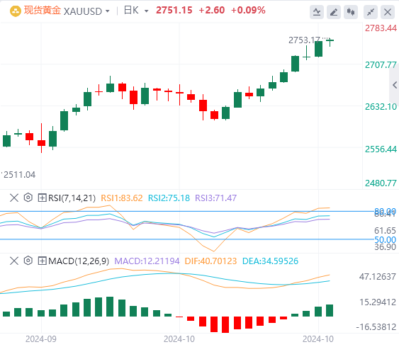 黄金攀升1%,创下历史新高,因美国大选的不确定性和中东战争等因素刺激了避险需求,加上对进一步放宽货币政策的预期放大了金价升势。现货金收盘上涨1.06%,至每盎司2748.4美元,盘中触及纪录高位2748.8美元附近。