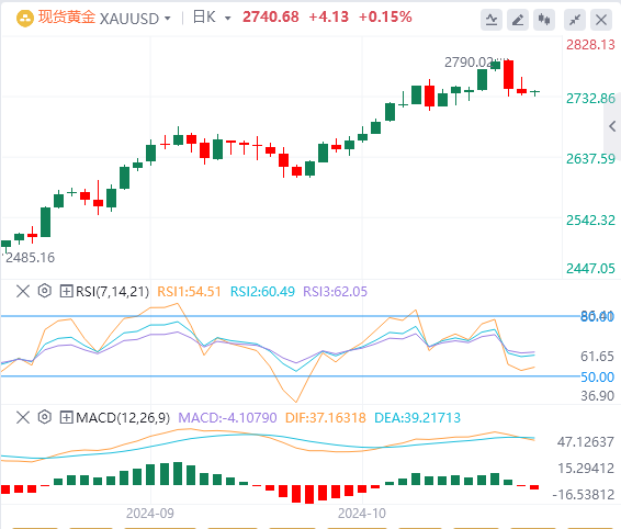 价格自低点起涨后,一路上行,随着多头动能持续强劲,最高上行至2789.8附近,短期受多头获利出场影响,价格有所回落,目前价格在4H级别布林下轨2730.3附近受支撑。结合CCI指标在超卖区间附近拐头走平,显示当前价格震荡概率加大,日内可在布林下轨2730.3附近,尝试布局多单。