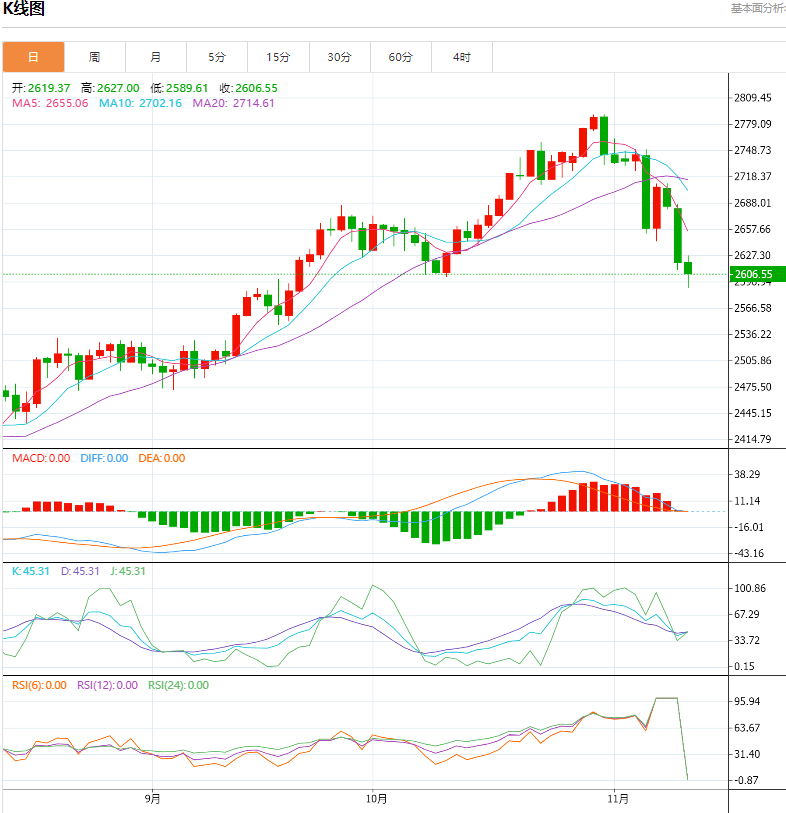 星期二(11月12日),消息面传来以色列内阁同意黎巴嫩停火协议框架,中东紧张局势有望缓解,并且美元持续走强,需求增长的悲观情绪持续打压,国际原油价格继续大幅回调,进入极弱空头下行通道。