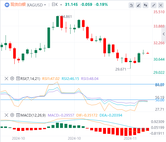 多头自29.67一线开始进场,价格不断创出新高,最高达到31.51一线,交易重心持续震荡上移,当前银价处于偏多走势中。均线系统上,60均线上穿100均线,且双均线拐头向上,表明银价处于偏多走势中。操作上,坚持顺势而为逢低做多的操作思路,关注支撑位30.80一线,如若在此震荡企稳,可考虑布局多单,上行关注31.57一线,若上破则进一步测试32.15的重要压力位。