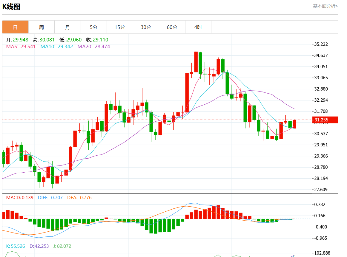 周四欧市盘中,现货白银报31.130,涨幅1.30%。