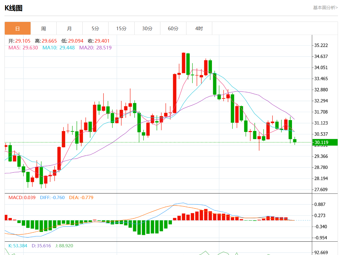 周二欧市盘中,现货白银报30.190,跌幅033%。