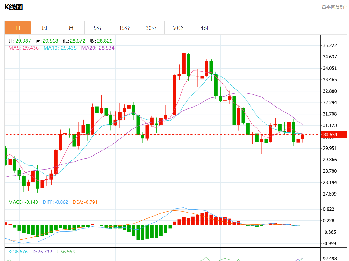 周三欧市盘中,现货白银报30.550,涨幅0.43%。