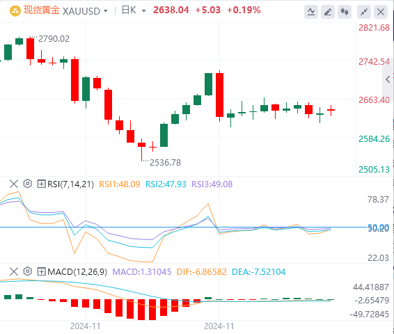 从形态结构看,黄金一直处于宽幅箱体震荡形态中,周五主力资金洗盘下跌破位支撑2624后反拉向上,表明市场是假跌真涨,主力意图就洗盘向上拉升。从k线力度看,早盘多头强势创新高且收大阳线表明多头力度强势,后市将继续延续多头行情。从下方MACD指标来看,快慢线0下方金叉信号出现,表明价格处于多头反弹浪当中。策略上建议顺多头趋势回调关键支撑位埋伏短多为主。