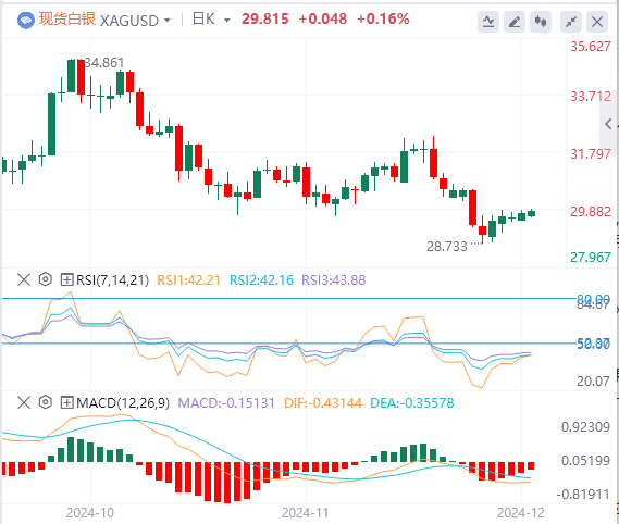 图中可见白银价格从高位回落后,价格呈现弱势行情,价格在低位附近虽有反弹,在1小时图中表现为逐步上行,但总体维持在箱体震荡中,叠加布林上轨对价格的压制,CCI指标在超买区间附近拐头向下,预示价格若不能有效上行,或将延续此前的下行趋势。因此,操作上建议逢高尝试做空思路为主。
