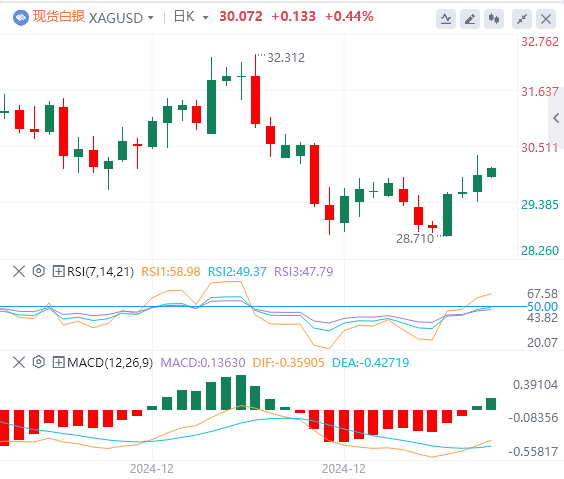 白银价格符合我们昨日多单的思路,29.50成功埋伏了多单。目前看价格的震荡形成双底,上破颈线位29.90一线,打开了上行空间,上方可以关注30.70附近的压力。指标上,均线开始形成金叉发散,表明价格的开启趋势走势,下方MACD指标维持在零轴上方区域,表明价格开始进入强势。所以,操作上建议回落接多为主。