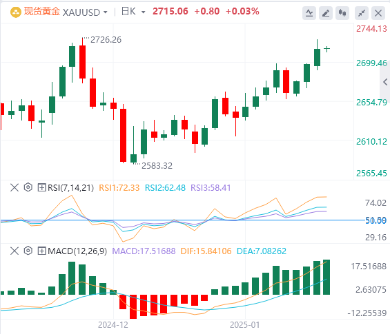 金价升至一个多月高点,因最新的美国经济数据进一步压低美债收益率,本周稍早公布的美国核心通胀数据疲软,增加了市场对美联储政策将更加鸽派的押注。现货金上涨0.7%至每盎司2713.8美元,盘中触及12月12日以来高位2724.6美元附近。