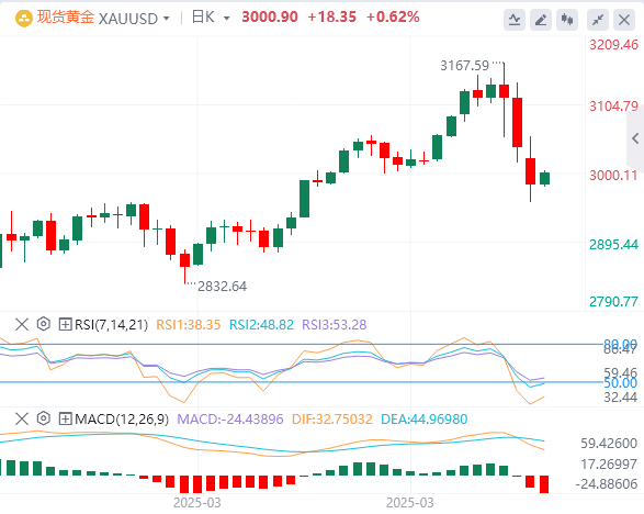 金价下跌近2%,在美国全面征收关税引发全球经济衰退的担忧之后,投资者转而将美元作为避风港。现货金下跌1.8%,至每盎司2982.34美元,盘初触及近四周低点2955.89美元。