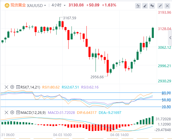 现货黄金日内大涨超3%,涨幅超100美元,并一度逼近3100美元关口,但未能站上此处,最终收涨3.27%,创近5年来最佳日表现,报3079.99美元/盎司附近。