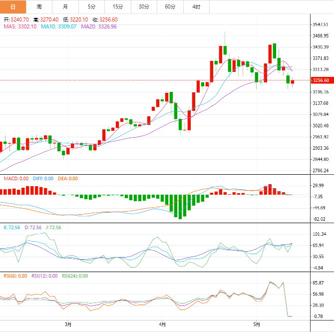 周二(5 月 13 日),国际黄金小幅上涨,截至发稿报 3256.60 美元 / 盎司,涨幅 0.15%,今日金价开盘于 3240.70 美元 / 盎司,最高上探 3270.40美元 / 盎司,最低触及 3220.10 美元 / 盎司。然而,昨日避险资产黄金遭遇重挫,暴跌近 3%。主要原因在于美中宣布贸易战暂时 “休兵” 之后,市场避险情绪大幅降温。截止周一收盘,国际黄金报 3235.39 美元 / 盎司,下跌 2.67% 。
