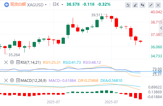 当前价格自高点回落后,呈现高低点同步下行的弱势行情,空头动能强势,均线系统MA20和MA60空头排列,同时布林带中轨和均线MA20共同对价格形成压制作用。CCI指标在超卖区间附近拐头向上,或预示行情短期有机会反弹向上,上方关注37.27附近压力。日内思路建议逢高做空为主。