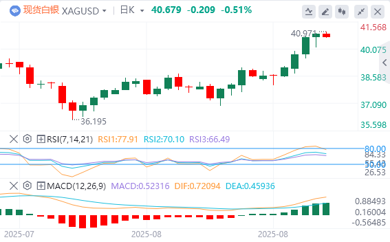 从形态结构看,白银低点不断抬高,沿着上涨趋势线不断震荡向上,标准多头趋势行情,局部做高位震荡整理形态,维持多头趋势不变,震荡后继续看多头延续上涨。从k线看,多头光头大阳线上攻,表明多头力量非常强势,后市预判行情延续多头浪走势。综合 MACD指标看,快慢线0轴上方运行,表明多头力量主导行情。策略上建议顺多头趋势浪找支撑埋伏多单思路为主。