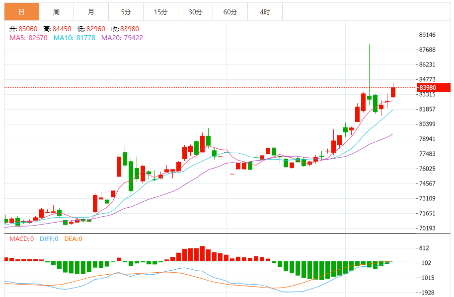 从波浪来看,白银当前处于自下方56.40一线开启上行的3浪过程之中,可尝试跟进。整体来看,白银呈现阶梯式强势单边上行节奏,高低点不断抬高。从下方MACD指标来看,量能处于零轴之上,并表现出多头量能的堆积。操作上建议逢低布局多单思路为主。
