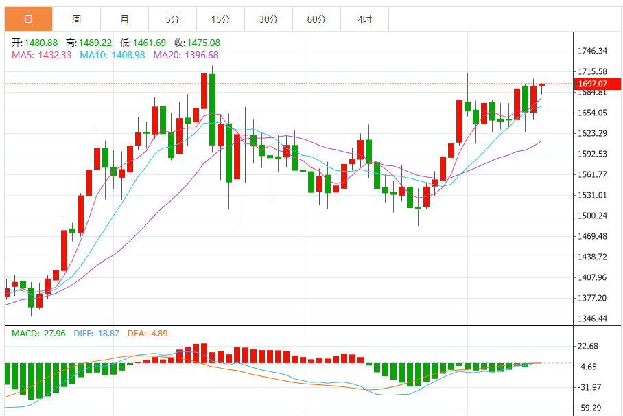 从波浪来看,黄金结束了3-3-5平台型调整结构,当前处于自下方4170一线开启新一轮上行的3浪之中,可尝试顺势跟进。整体来看,黄金一举向上突破了长期盘整区间。从下方MACD指标来看,量能处于零轴之上,并表现多头量能的放量。操作上建议逢低布局多单思路为主。
