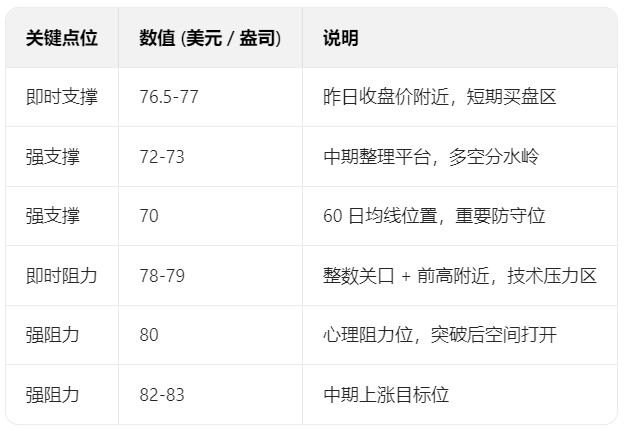 短线策略:回踩76.5-77美元区间轻仓做多,止损75美元下方,目标78-79美元;突破79美元可加仓做多,目标80-82美元