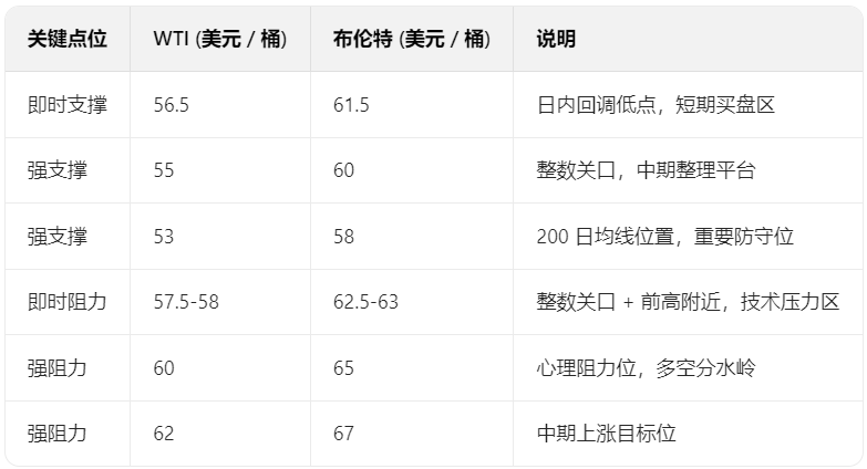 多数机构认为原油短期维持偏弱震荡,关注57-58美元关键阻力能否突破,若无法突破则可能继续下行测试55美元支撑
