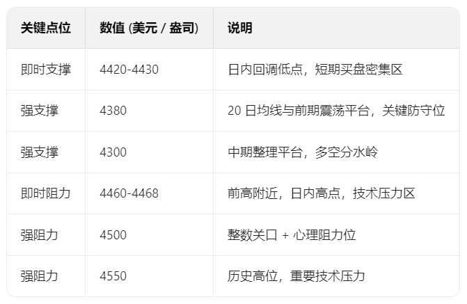 短线策略:回调至4420-4430区间轻仓做多,止损4400下方,目标4460-4480;若突破4468可加仓做多,目标4500;若跌破4380则减仓观望,等待更低位置接回