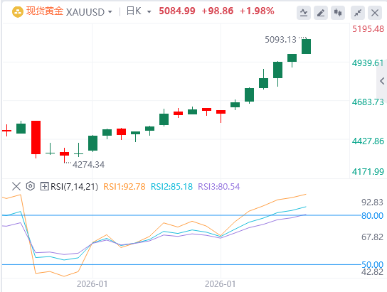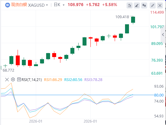 上周五白银首次升至100美元/盎司以上,黄金则再创新高,距离5000美元/盎司仅咫尺之遥,地缘政治动荡且预期美国将降息之际,投资者纷纷涌入避险资产。现货白银跳涨7%,收报102.9467美元/盎司。现货金报每盎司4982.57美元,上涨近1%,此前创下4989.61元的纪录新高。