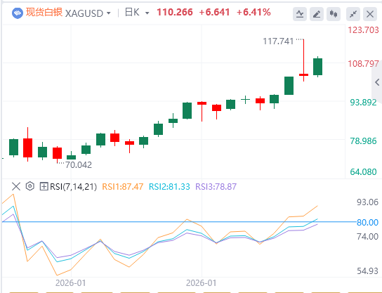 从图中可见,价格自低位起涨后,整体保持强势上行,中间有过震荡调整,但价格再次拉升并创新高直达117.65附近,随后价格在美盘末端快速回落,测试均线MA60后快速回弹,这表明多头动能并未消散,价格在测试前期震荡区间后空头出场,同时布林带下轨目前对价格同样具有支撑作用,CCI指标在超卖区间附近拐头向上,或预示行情有进一步上行的机会。操作上建议逢低布局多单思路为主。