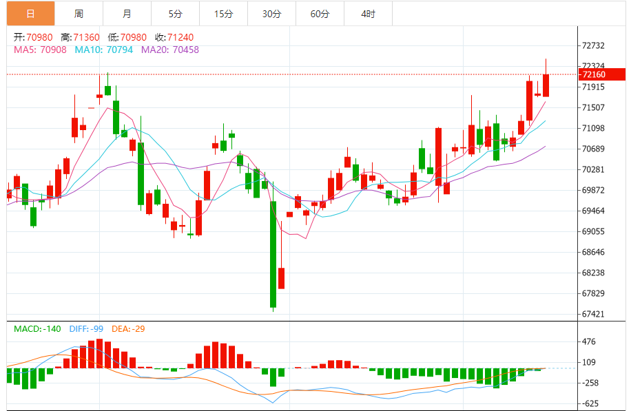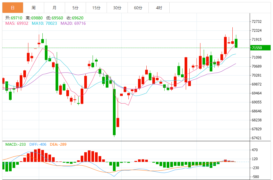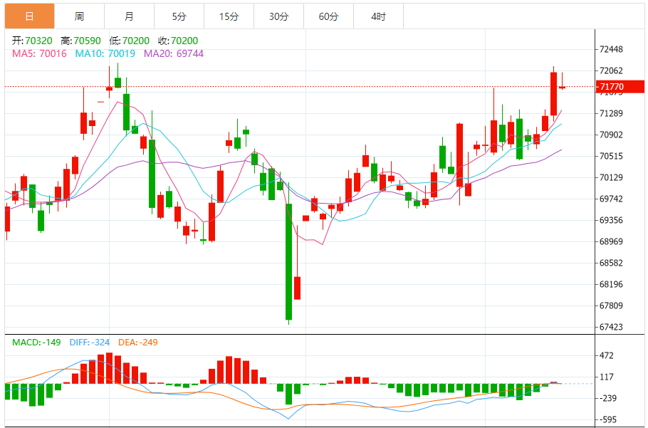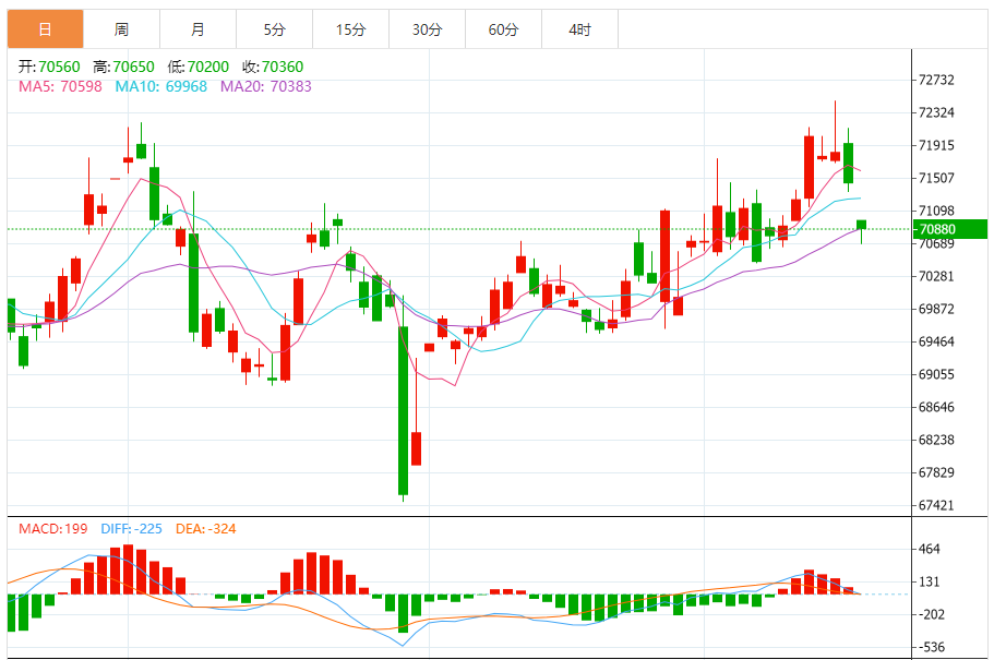 黄金: 价格表现:截至21时39分,国际黄金期货(纽约金)价格为3727.3美元/盎司,上涨8.3美元,涨幅0.22%,最高3737.6美元/盎司,最低3711.8美元/盎司;国际黄金现货(伦敦金现)价格为3696.01美元/盎司,上涨19.28美元,涨幅0.52%,最高3699.32美元/盎司,最低3674.51美元/盎司。 走势分析:从技术面来看