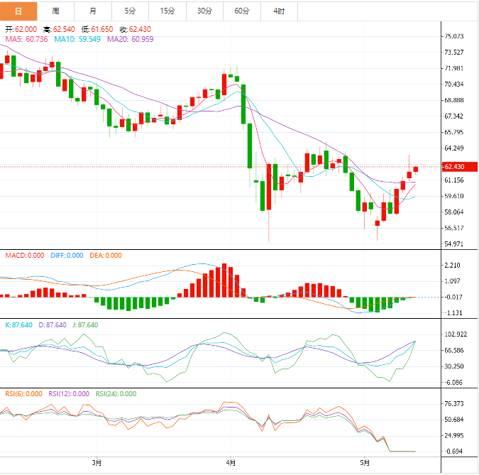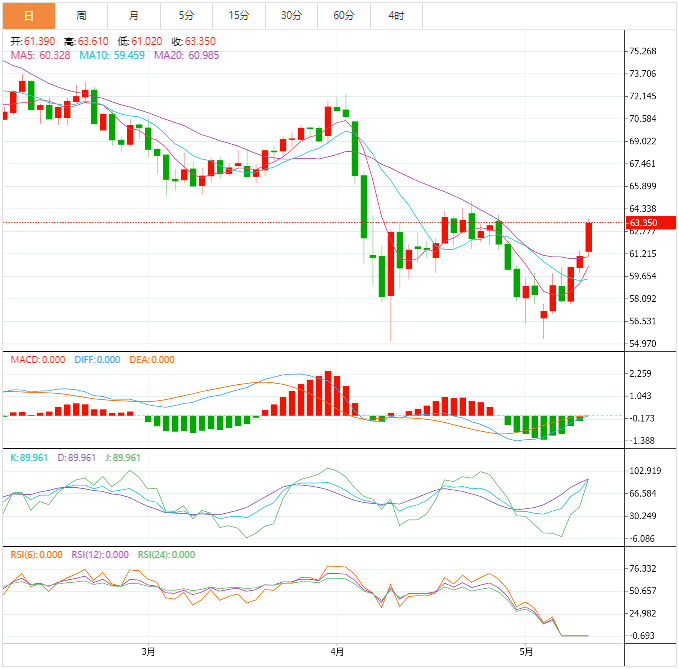 今日(5月12日),金融市场上原油与黄金价格走势备受瞩目。二者作为重要的大宗商品,不仅反映着全球经济的供需状况,也与地缘政治、国际贸易等因素紧密相连,其价格波动时刻牵动着投资者的心弦。在今日复杂多变的市场环境下,原油与黄金价格呈现出各自独特的走势,以下为您带来详细的盘面分析。 原油盘面分析 截至